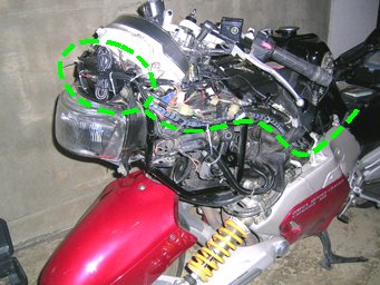 かといって、あのでかいアッパーカウル内にも意外とスペースが無いのです。なんだかわからないハーネス類やリザーバタンク等がぎっしり詰まっているのです。ラジエータがかなり上の方にあるので、アッパーカウル内でも下の方は空気の流入経路となっていてモノが置けるような構造になっていません。