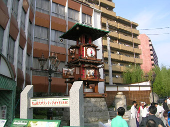 ちんちん電車で温泉まで行くと、ちょうど17:00でからくり時計が動くところだった。坊ちゃんコスプレの人々がなにやら解説をしてる。