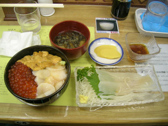 一応、朝市の中の店でウニ、イクラ、ホタテの海鮮丼みたいのとイカソーメン食べましたが、別に普通でしたね。残念。値段はご立派です。