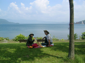 湖畔で弁当を広げることにしました。