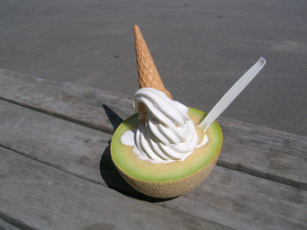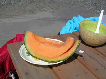 カットメロン用として切ってあったのが丁度前の客で売り切れてしまって、わしが頼んだら新しいのを切ってくれたんですが、どうも大当たり玉が出たようです。更に手先が狂ってしまって、どでかい一切れができてしまいました。切っていたお姉さんやおばちゃんも大爆笑。そのままそのデカイのをくれました。