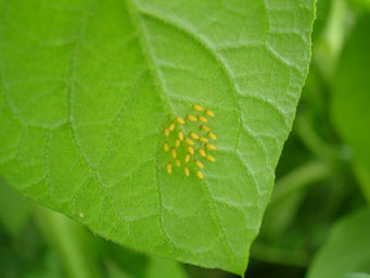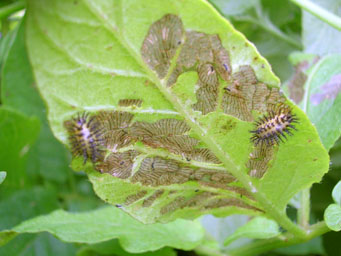 ジャガイモはテントウムシとの戦い。ニジュウヤホシテントウが次々と飛来します。