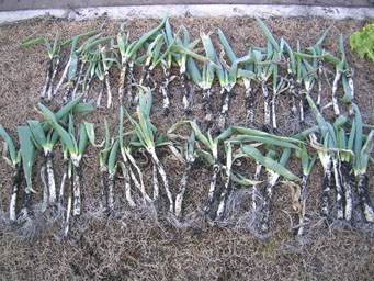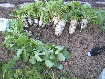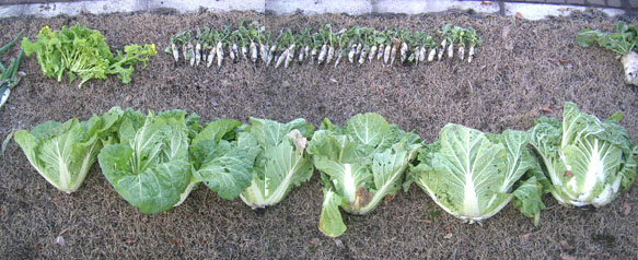 大根・ニンジン・ネギなんかは土付きのまま倉庫へ。ホウレンソウは湯がいて冷凍。白菜は順次キムチにしましょう。