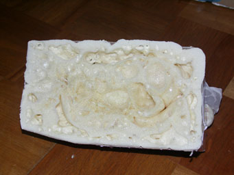 それから、十分な剛性が出ないのでは?という心配も、結果的に予想以上に固まってスタイロフォームみたいなザクザクした塊になりました。これなら素材としては十分使えます。