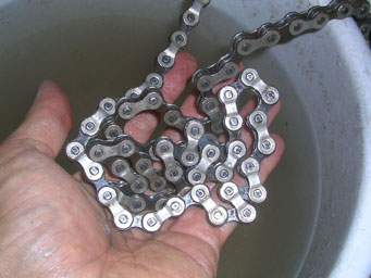 薄めた液を浸したウエスで包んでよーく揉み解したあと、バケツの真水でジャブジャブ洗っただけです。ギシギシだったのにシャカシャカ動くようになりました。それでもチェーン自体の寿命感は否めませんが。