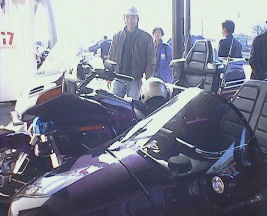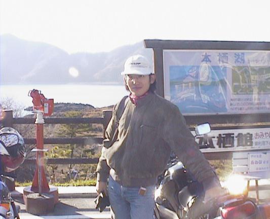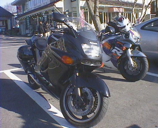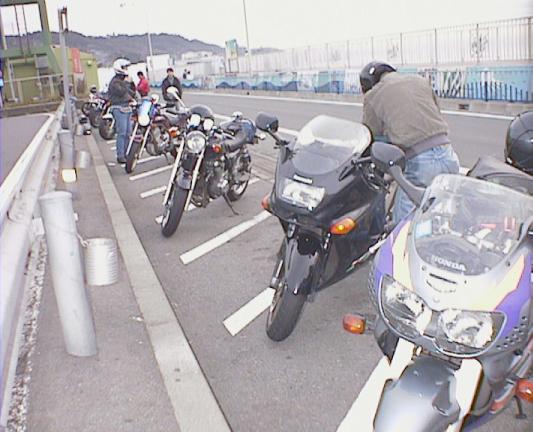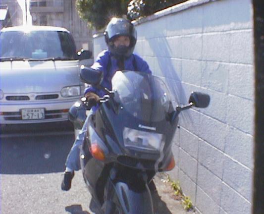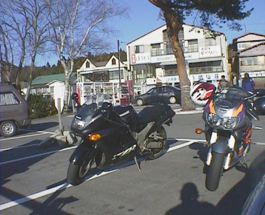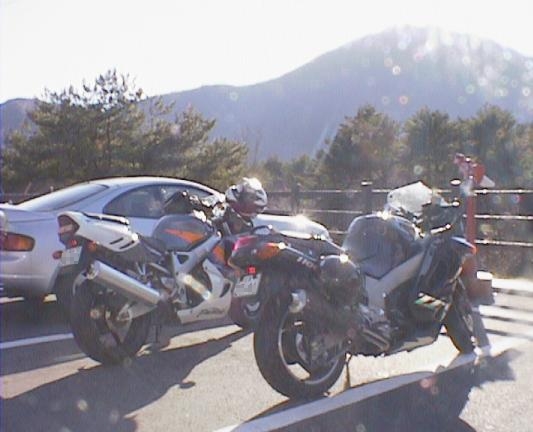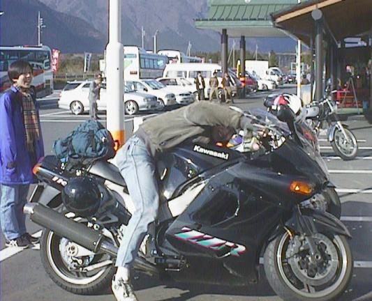 近くのスカイラークガーデンでお茶して、出発。これ、ヒヨッ子 with ZZ-R1100。 小学生がもがいているように見える。結構さまに なってるぜ、ヒヨッ子! どうでもいいがこれみて ると、後輩のカジワラ君を思い出す。死ぬ程似てるぜ。困る。困らん。どっちや。