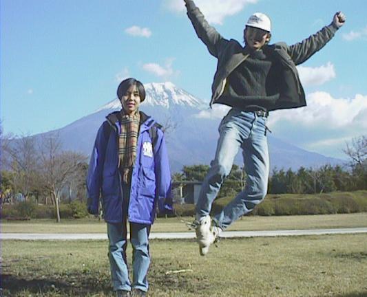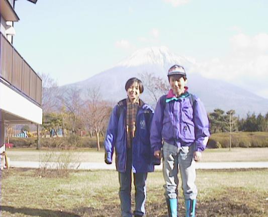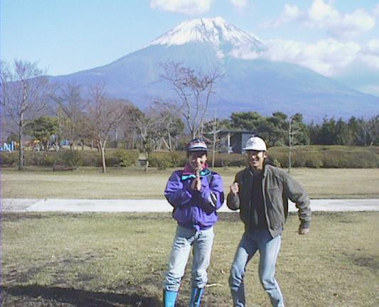もちやの裏で富士山。あーわし富士山こんな近く でみたのはぢめてー! 広瀬君とヒヨッ子わしとヒヨッ子。ついジャンプしてしまった。広瀬君とわし。ついポーズをとってしまう。