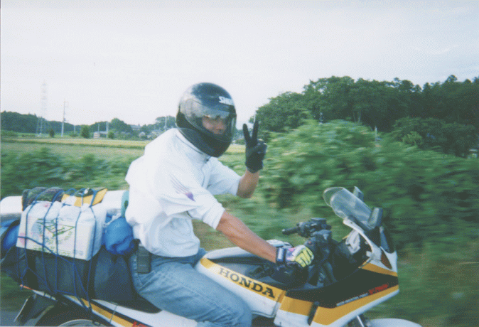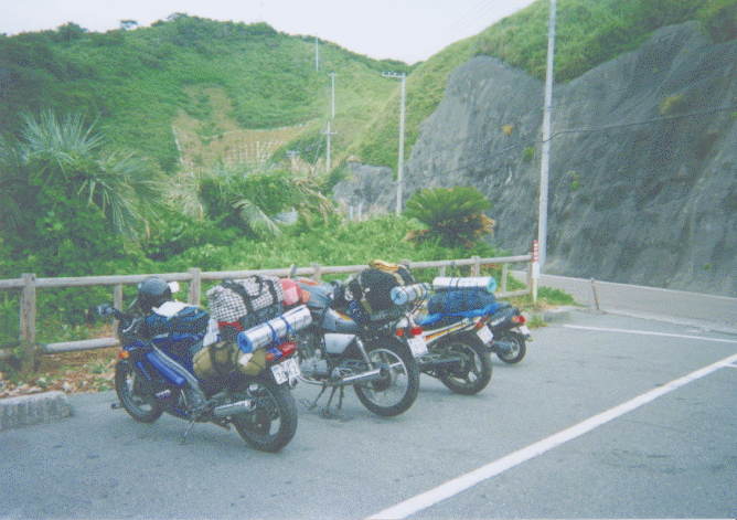 痺れを切らしてトクザワ号を探しに行く。ああいた。向かう途中だったらしい。 その後タナカも到着。トクザワ号、山盛りのように荷物をつんでいる。大丈夫な のか。サイドスタンドをたてたら、重心が高すぎたらしくいきなり立ちゴケ。引 き起こすと今度は反対側に立ちゴケ。大丈夫だろうか...。不安がよぎった。