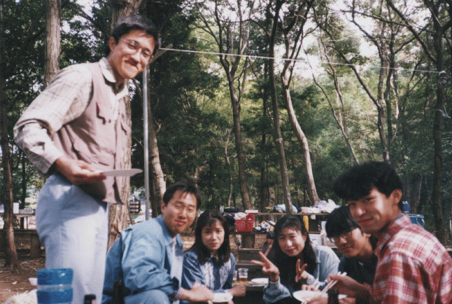 これはなんじゃ、オフつくばバーベキューオフで撮った写真じゃな。一番左で立っ ているのが電総研のh坂根さん。スケベなので h を名前の前に付ける事になって います(うそ)。その右側が前述の高橋さん、真中のきれいどころ二人は高エネ研 の森田さんのお知り合い。その 右がわし。一番右は猿渡君。彼は行方不明だ。一体いずこへ。