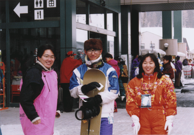 これも電総研スキーツアーの写真。左が超有名な yoshinov さん。まんなかでス ノーボードを抱えてるのが自分。ちなみにこのボードはつくばで買える一番安い 組合せ。スポーツは道具じゃねーよ、腕だよ、パワーだよ、根性だよ!(多分)。 右側は高橋さんのお知り合い。お名前失念しました。ごめんなさい。