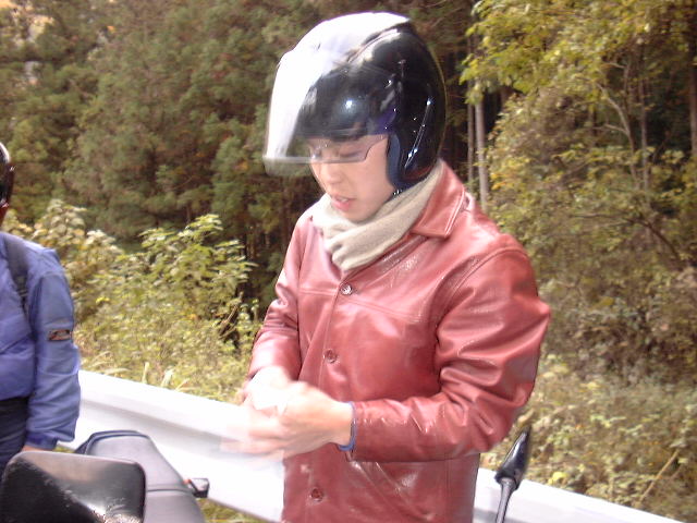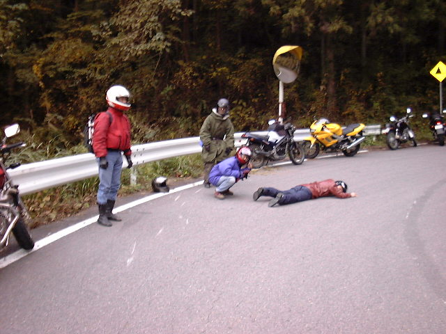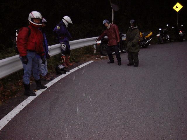 私の直後を走っていた須藤さんがやってしまった. その後,2グループに分かれて温泉までむかったので後で症状を聞いたのだが, スピードメーターをやってしまったとのこと.皮ジャンにも穴が開いてしまった. うーん,もったいない.