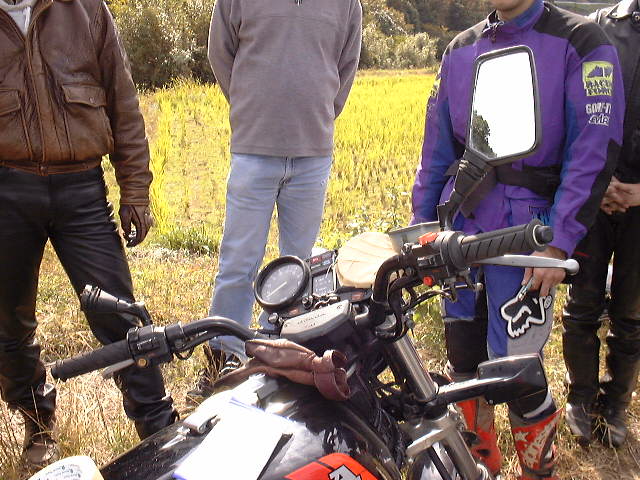 とりあえずダートを過ぎて,舗装路に入ったところに集合することになった. 普通にダートを越えて,舗装路になったところでバイクを止めた,ら‥‥ いきなりやってしまった.下り坂になっているところに不注意に止めてしまって, バイクをコカしてしまった.痛恨の止めゴケ. 左前のウインカーの破損と左足ステップをちょっと曲げてしまった. 別に走行には問題ないのだが,とりあえずガクさんにガムテを借りて, ウインカーを補修する.でもあまり気落ちしなかった.なぜだろ.