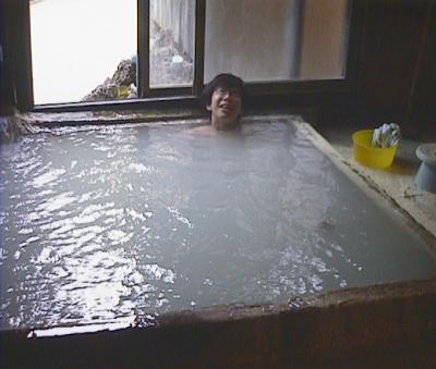 サッシの外は露天風呂。底が見えず、ゴツゴツしているので油断するとコケます。