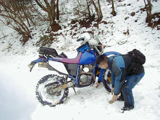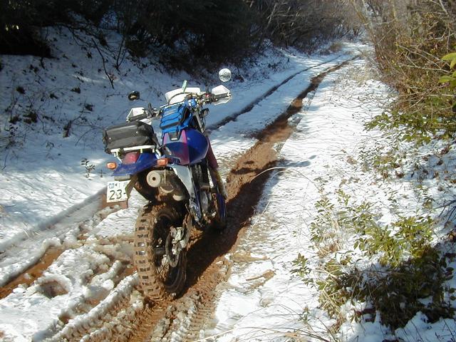 場所によっては融け始めた雪で道が泥々、バイクも 泥々に。