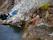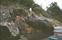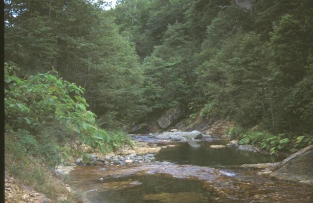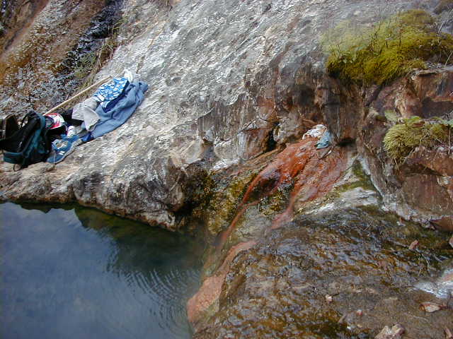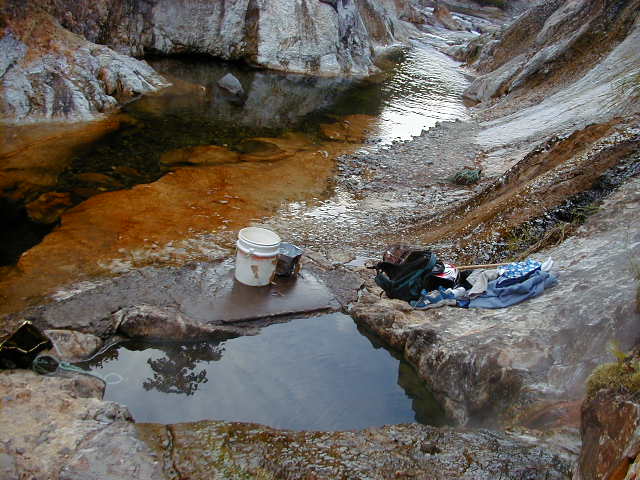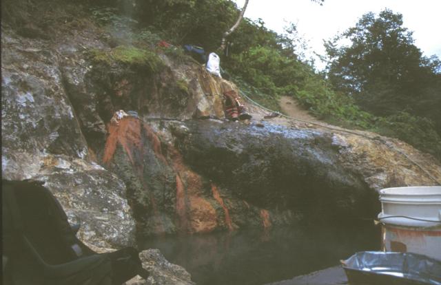 温泉へ分岐したすぐ先に土が盛られて通行止めとなっている。ただし、 バイクなら越えられる。そこから徒歩だと3分位登った所で河原に下り ると岩をくり抜いたような湯舟がある。なお、河原に下りる所は急で滑べ りやすいので注意が必要です。 岩の割れ目から熱い湯がチョロチョロと湯舟に流れ込んでいる。湯量は少 ないが熱い。湯舟の湯もちょっと熱かったので、備え付けのバケツで川の 水を汲んで注いだ。湯舟から少し上流の河原からも湯気が上がっており、 他にも入湯出来そうなポイントがありそうだ。 |